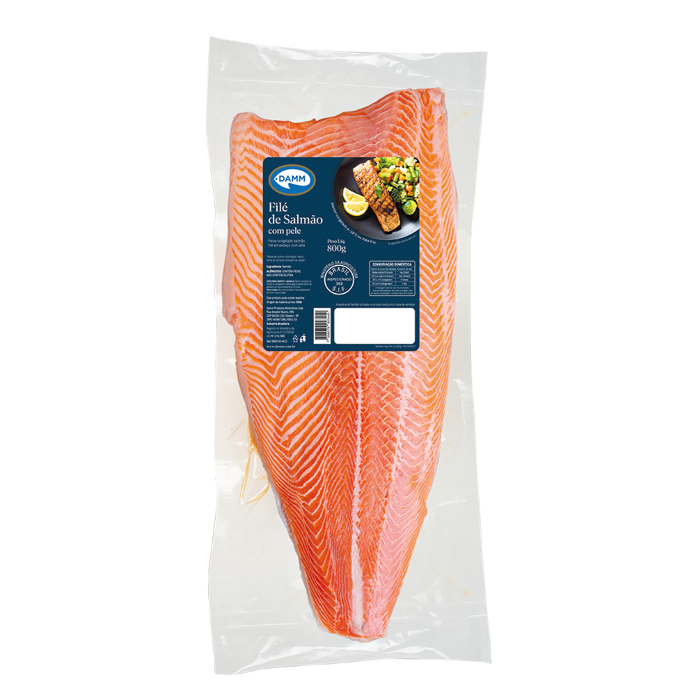 O delicioso salmão Damm é criado nas águas frias do pacífico próximo ao Polo Sul, possui excelência nas certificações ASC e BAP de sustentabilidade e responsabilidade ao meio ambiente. Além de ser rico em ômega 3, proteínas de alto valor biológico e em vitamina D, e livre de conservantes e de aromas e colorações artificiais. O filé de salmão com pele Damm é indispensável para a criação de pratos quentes e saborosos.